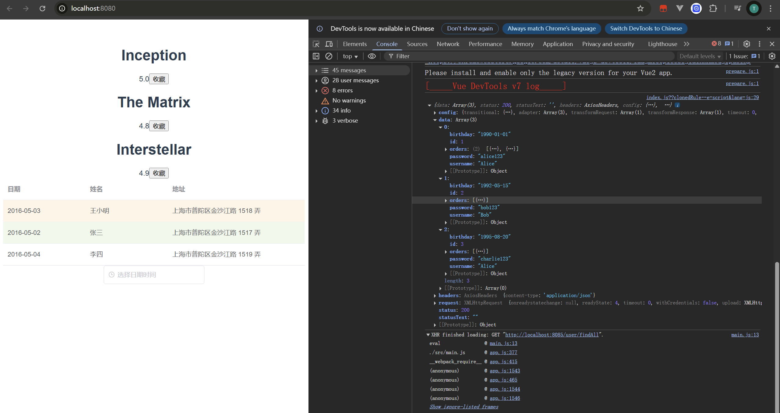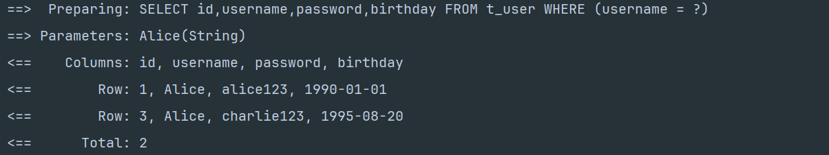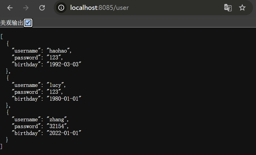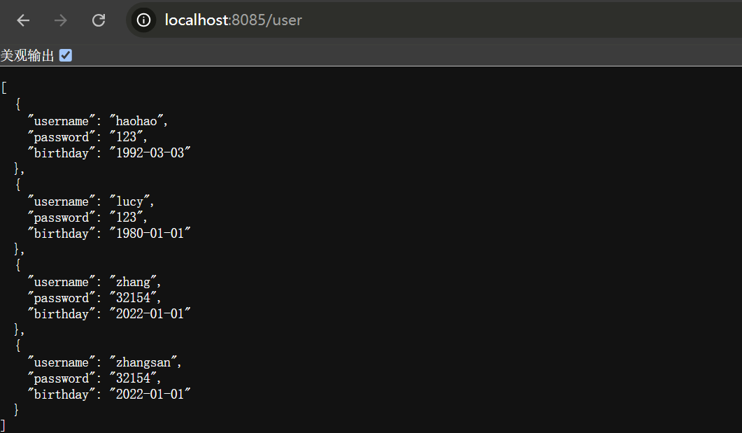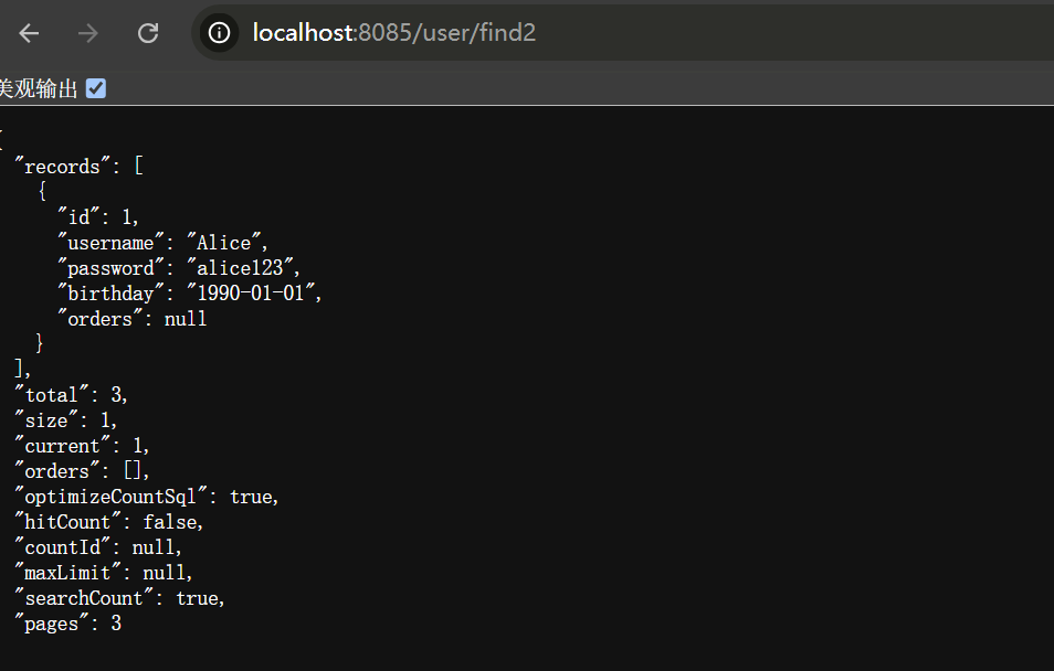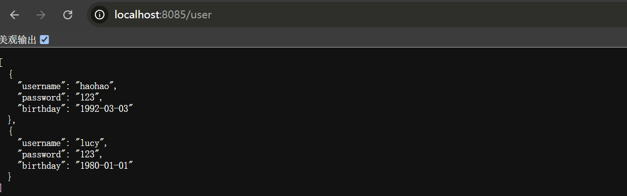 1 2 3 4 5 6 7 @GetMapping("/user/{userId}") public Result<User> queryUser (@PathVariable Long userId) { log.info("查询用户:{}" ,userId); User user = userService.getById(userId); return Result.success(user); }