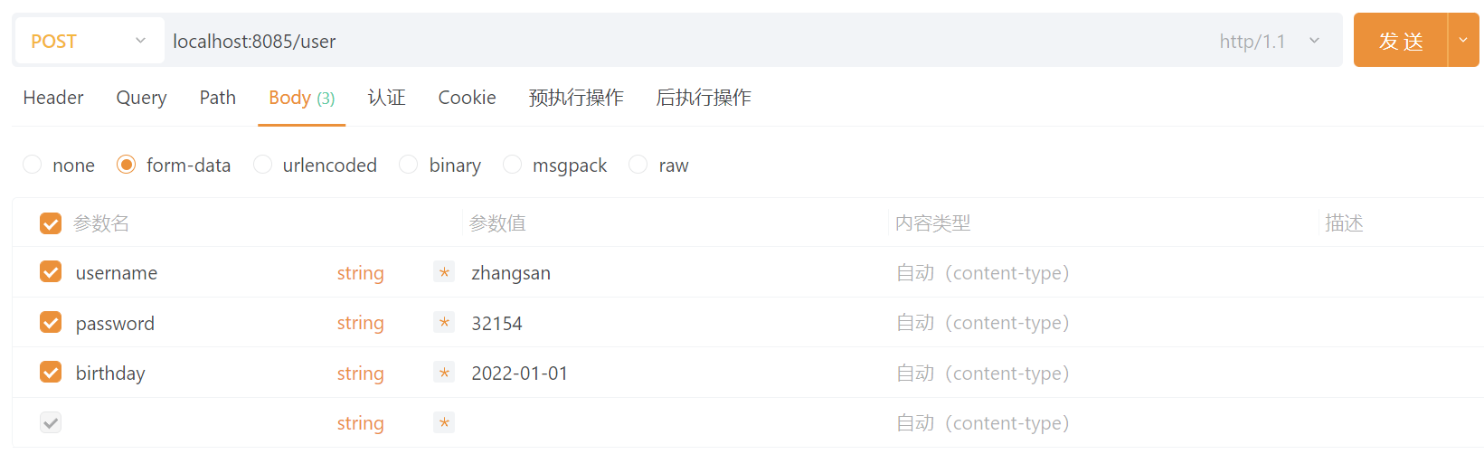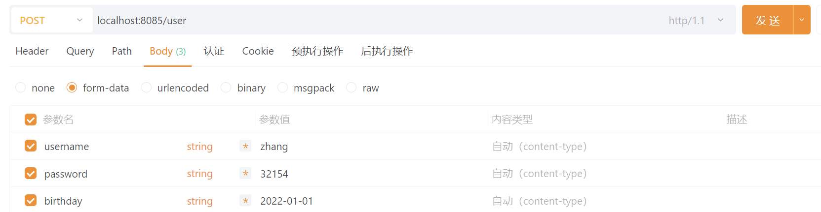 一般参数的请求体构造 POST 的参数是放在请求体里面的,接下来演示含有请求体的,后端代码如下: