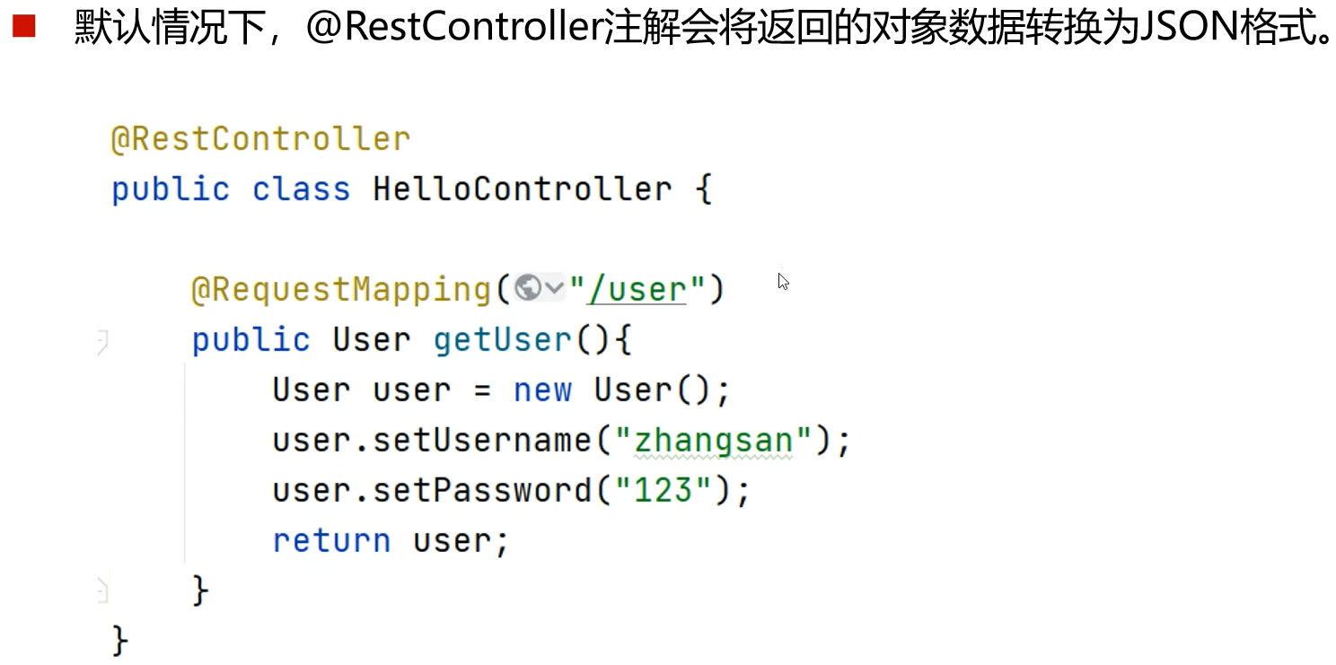 @RestController 注解 ,则返回的是方法指定的返回类型。例如:如果返回类型为 ModelAndView 则返回指定的jsp 页面,如果是 String 则返回字符串,如果是 JSONObject 则返回json对象。默认情况下,@RestController 注解返回 JSON 格式 。