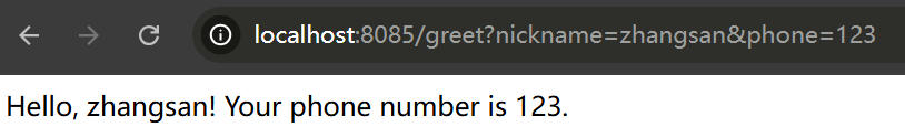 参数不一致的 QueryString GET 1 2 3 4 5 @GetMapping("/greet2") public String greet2 (@RequestParam(value = "nickname", defaultValue = "Guest") String name, @RequestParam(value = "phone", required = false) String phone) { return "Hello, " + name + "! Your phone number is " + phone + "." ; }