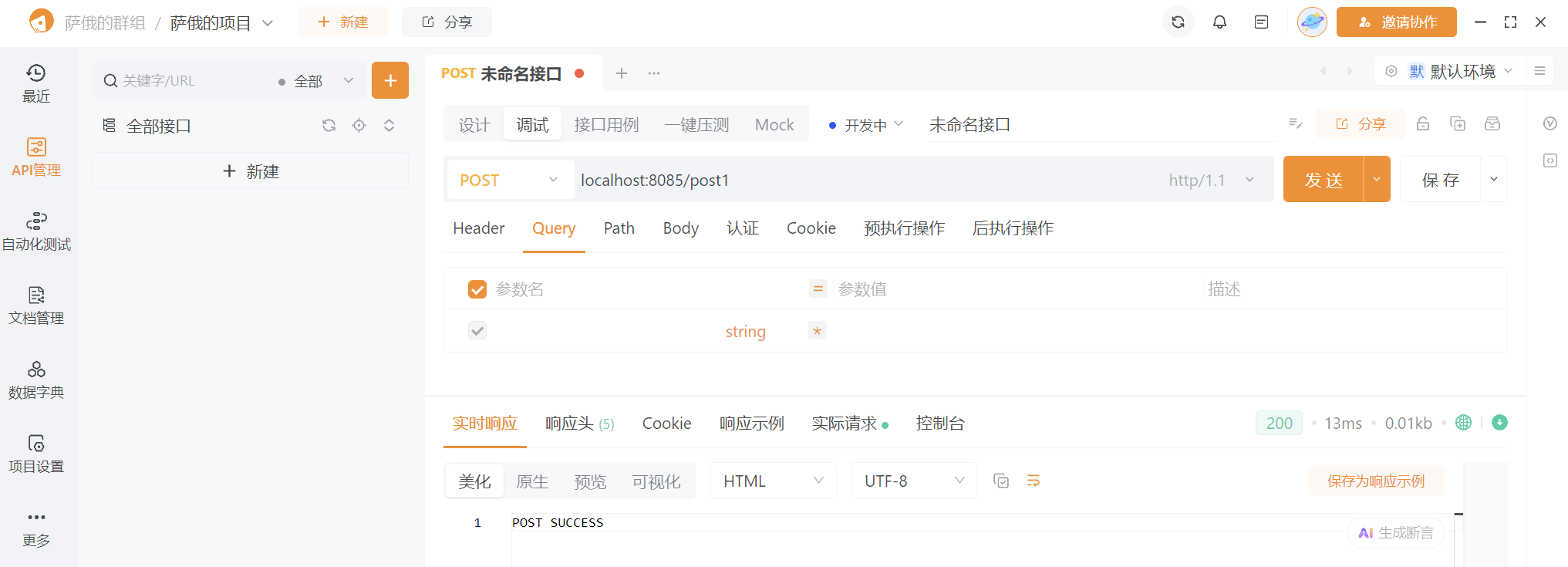 1 2 3 4 5 @PostMapping("/post1") public String post1 (String a) { System.out.println(a); return "POST SUCCESS" ; }