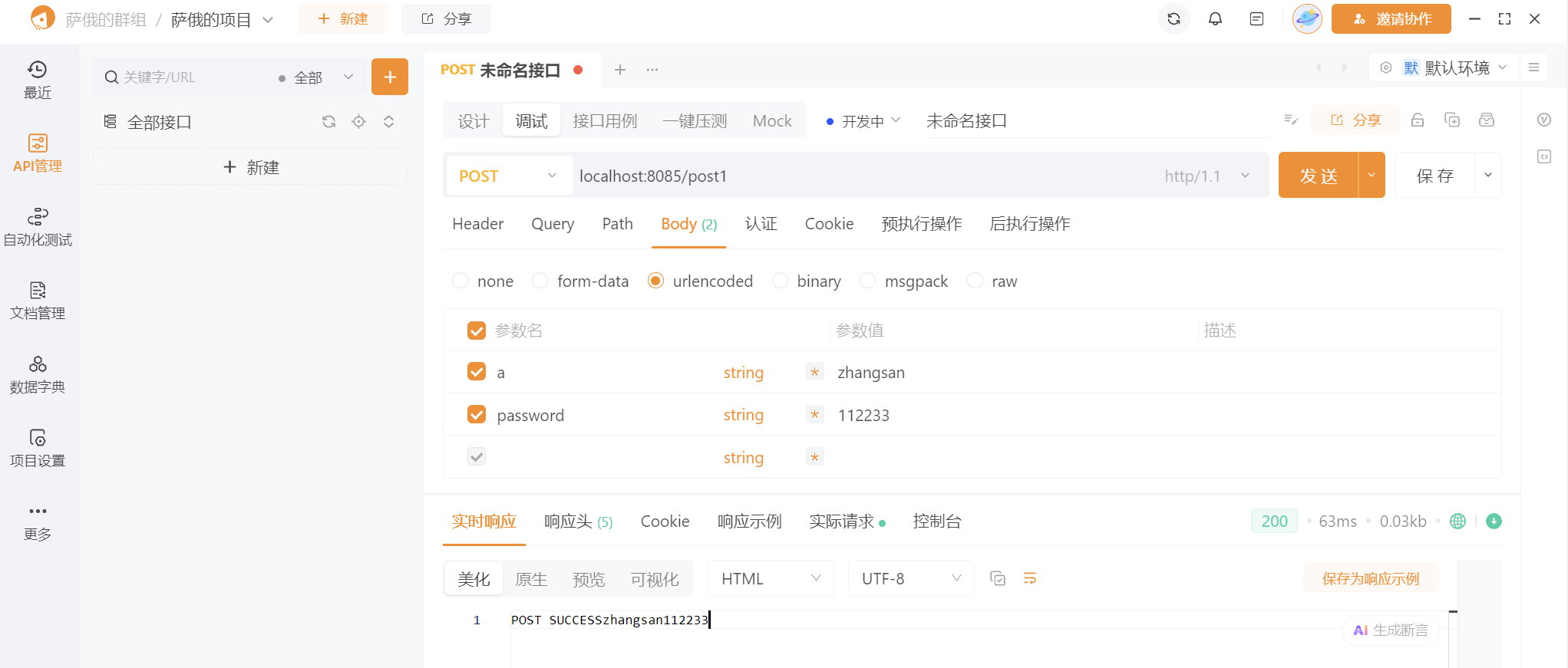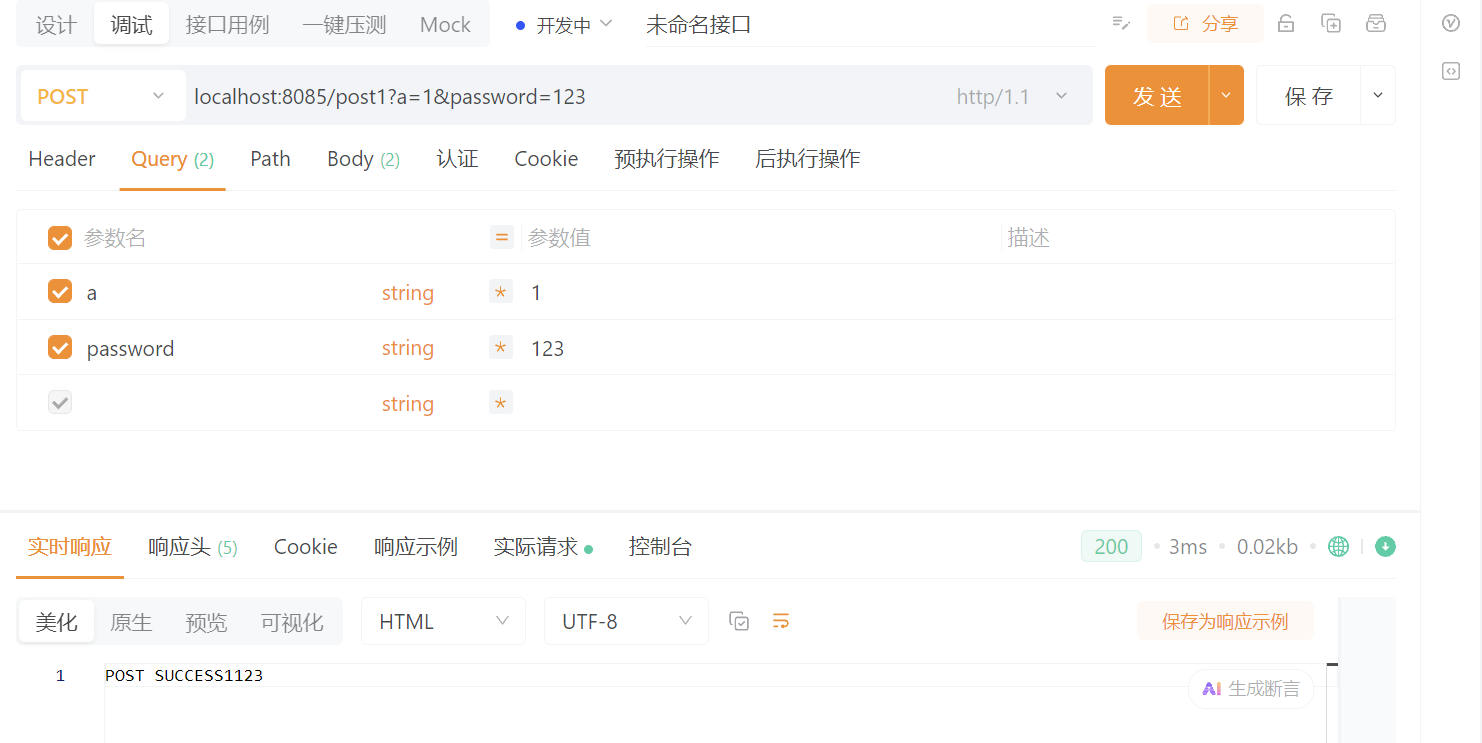 1 2 3 4 5 6 @PostMapping("/post1") public String post1 (String a, String password) { System.out.println(a); System.out.println(password); return "POST SUCCESS" + a + password; }