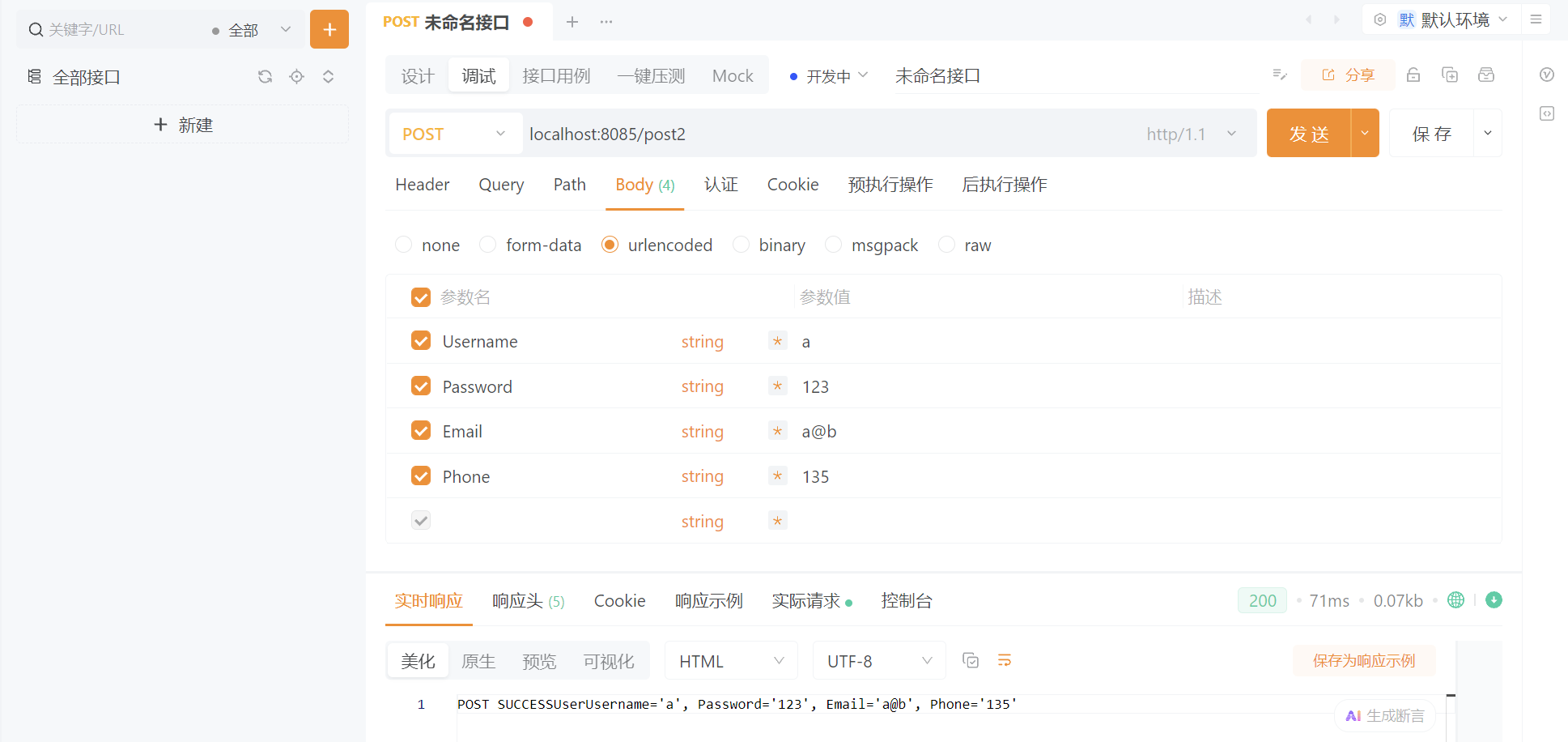 1 2 3 4 @PostMapping("/post2") public String post2 (User user) { return "POST SUCCESS" + user.toString(); }