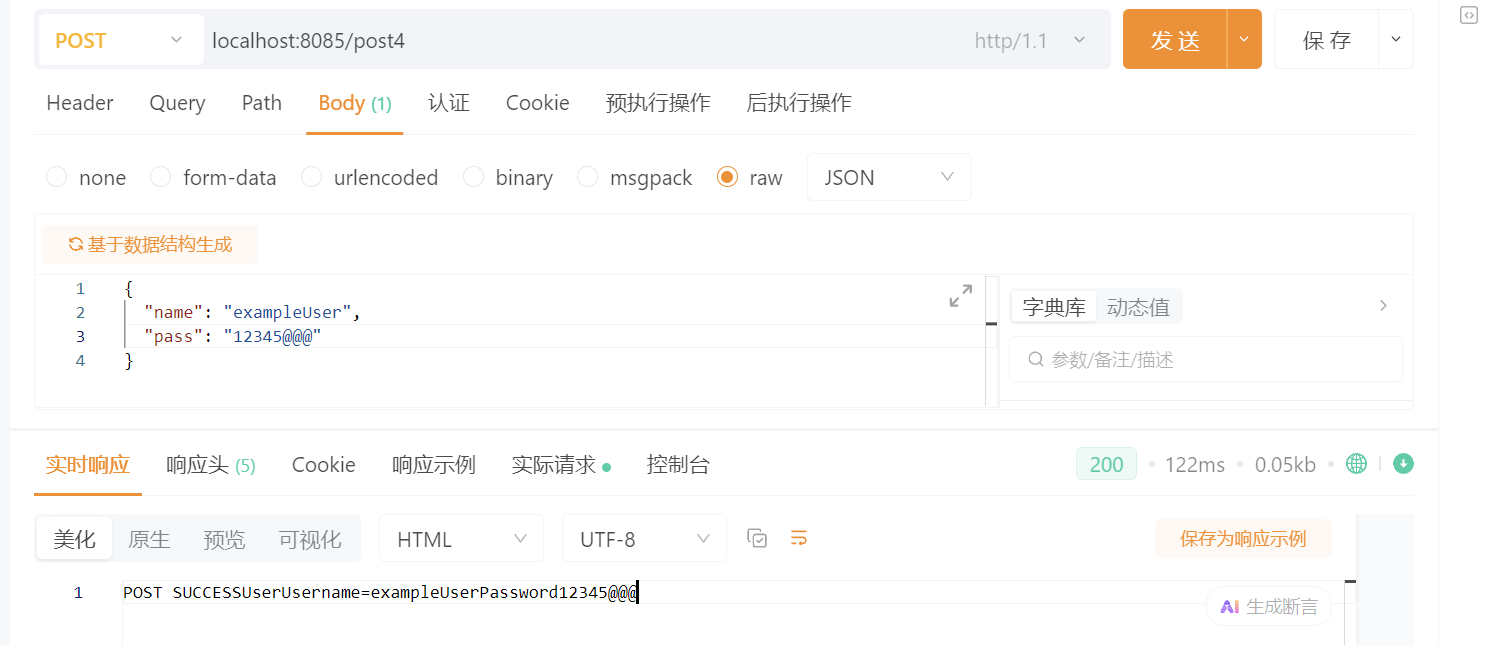 1 2 3 4 @PostMapping("/post4") public String post4 (@RequestBody User2 user) { return "POST SUCCESS" + user.toString(); }
