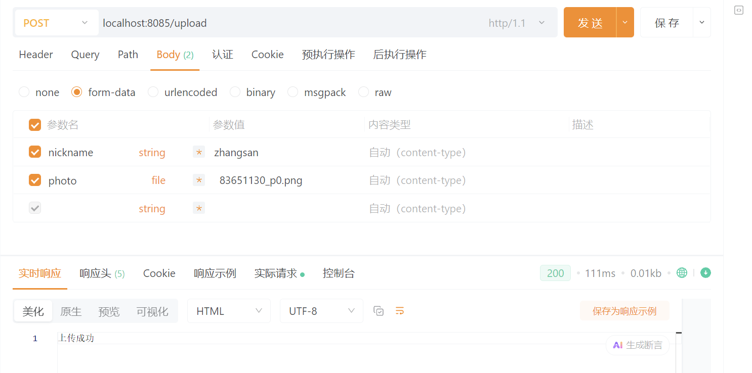 1 2 3 4 5 6 7 8 9 10 11 12 13 14 15 16 17 18 19 20 21 22 23 24 25 26 27 28 29 30 31 32 33 34 35 36 37 package org.ren.demo.controller;import org.springframework.web.bind.annotation.PostMapping;import org.springframework.web.bind.annotation.RestController;import org.springframework.web.multipart.MultipartFile;import javax.servlet.http.HttpServletRequest;import java.io.File;import java.io.IOException;@RestController public class FileController { @PostMapping("/upload") public String up (String nickname, MultipartFile photo, HttpServletRequest request) throws IOException{ System.out.println(nickname); System.out.println(photo.getOriginalFilename()); System.out.println(photo.getSize()); System.out.println(photo.getContentType()); String path = request.getServletContext().getRealPath("/upload/" ); System.out.println("Upload path: " + path); saveFile(photo, path); return "上传成功" ; } public void saveFile (MultipartFile photo, String path) throws IOException { File dir = new File (path); if (!dir.exists()) { dir.mkdir(); } File file = new File (path+photo.getOriginalFilename()); photo.transferTo(file); } }