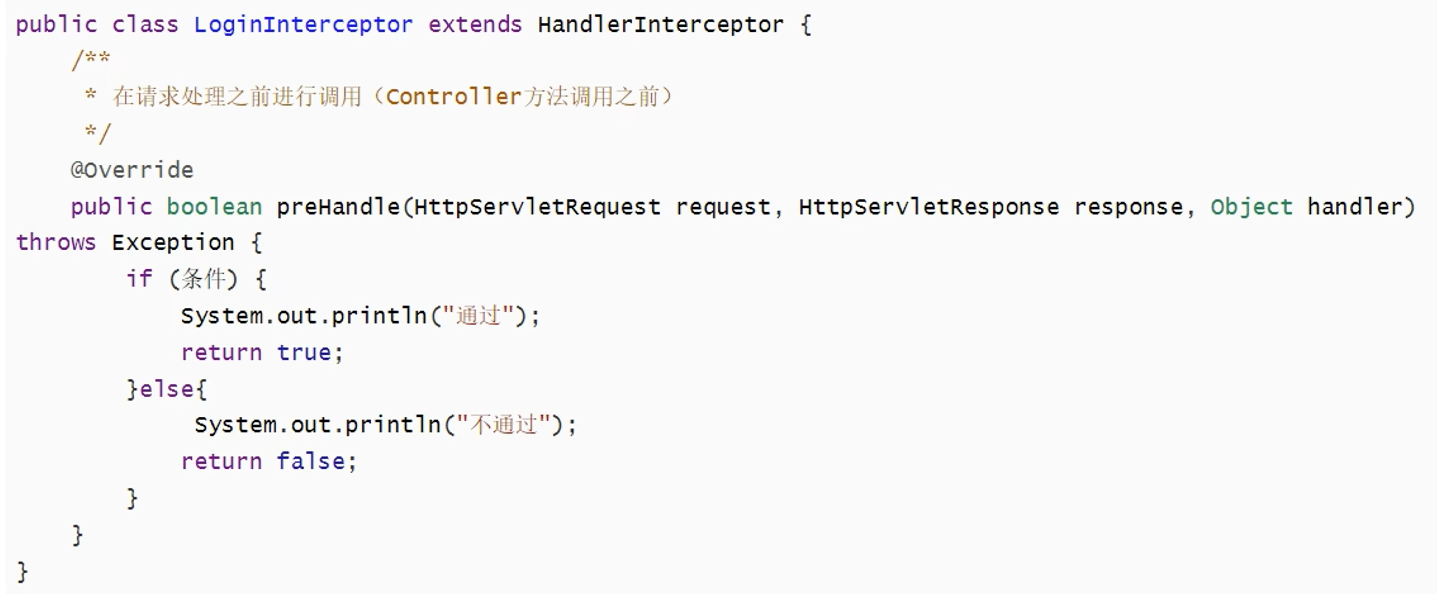 1 2 3 4 5 6 7 8 9 10 11 12 13 14 15 package org.ren.demo.interceptor;import org.springframework.web.servlet.HandlerInterceptor;import javax.servlet.http.HttpServletRequest;import javax.servlet.http.HttpServletResponse;public class LoginInterceptor implements HandlerInterceptor { @Override public boolean preHandle (HttpServletRequest request, HttpServletResponse response, Object handler) { System.out.println("LoginInterceptor: preHandle false" ); return false ; } }
