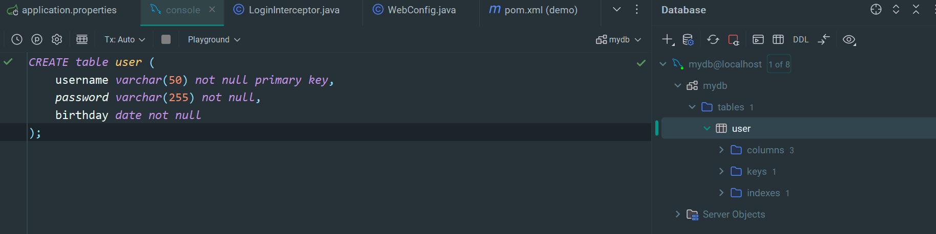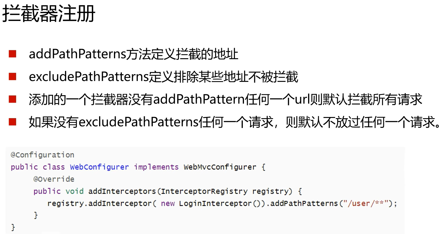 1 2 3 4 5 6 7 8 9 10 11 12 13 14 15 package org.ren.demo.config;import org.springframework.context.annotation.Configuration;import org.springframework.web.servlet.config.annotation.InterceptorRegistry;import org.springframework.web.servlet.config.annotation.WebMvcConfigurer;import org.ren.demo.interceptor.LoginInterceptor;@Configuration public class WebConfig implements WebMvcConfigurer { @Override public void addInterceptors (InterceptorRegistry registry) { registry.addInterceptor(new LoginInterceptor ()).addPathPatterns("/user/**" ); } }