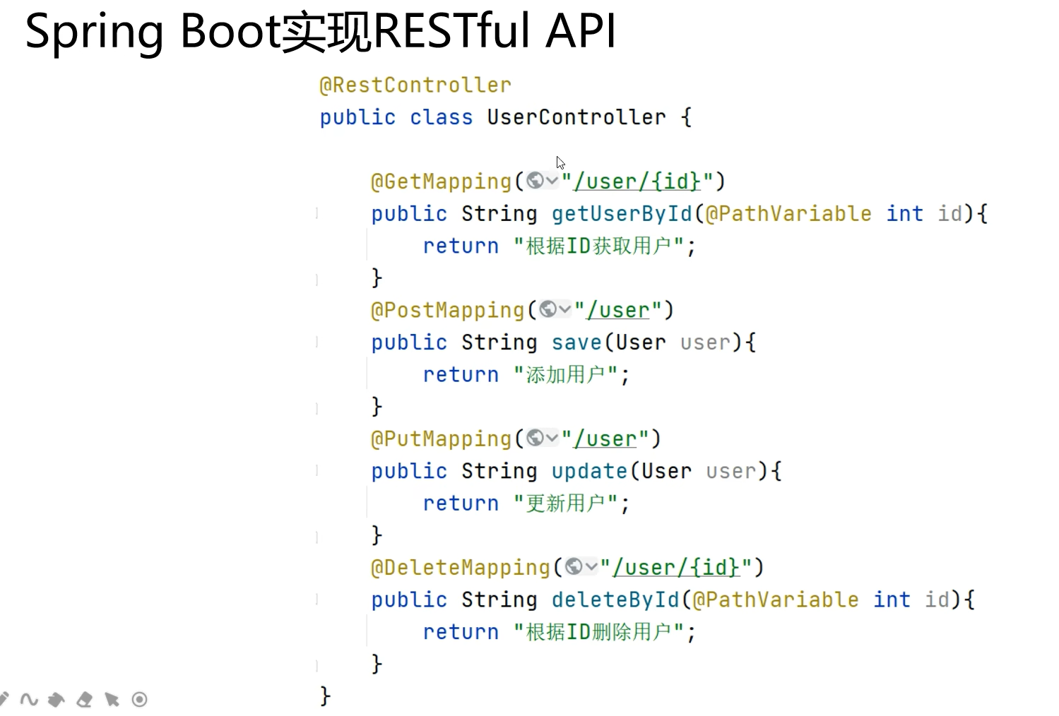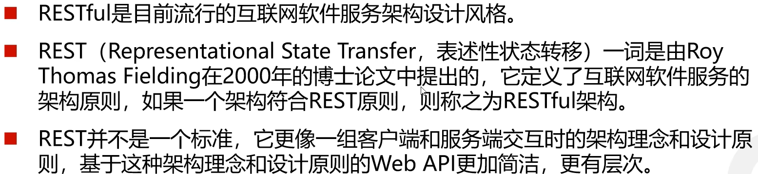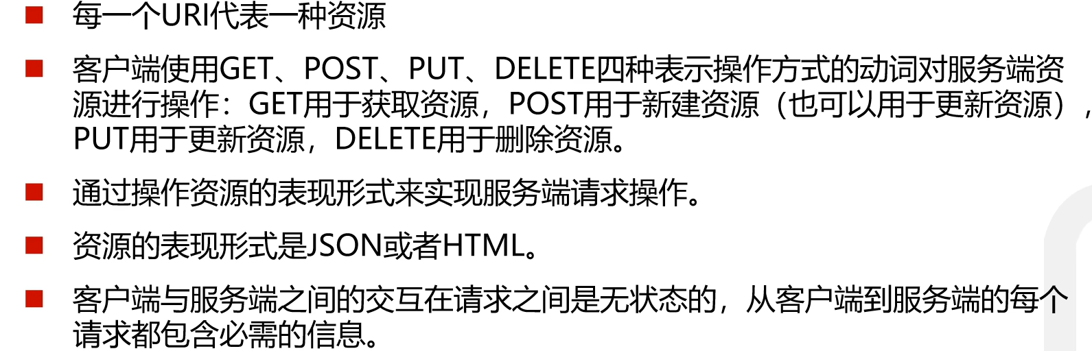 传统方法中,删除用户使用 GET 请求,然后在 url 中使用 delete 之类的动词,但是在 RESTful中,直接使用 DELETE请求,并且直接在 url 中传 /user/id,url 中不包括动词。