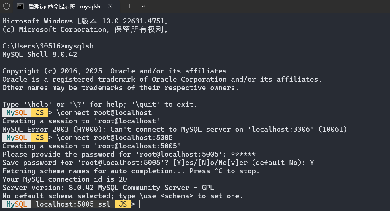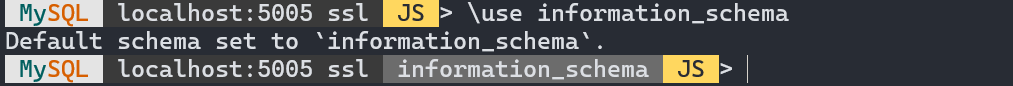 注意,由于我们之前修改了端口,因此不能够直接用 root@localhost 进行连接,不然会报错,必须使用命令 \connect root@localhost:5005 进行连接。连接之后提示我们 type \use <schema> to set one。