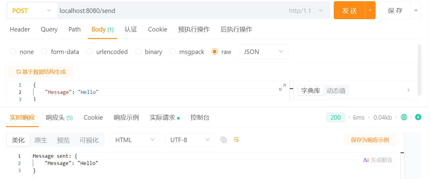 先启动生产者,使用apipost发送一条消息,然后启动消费者: