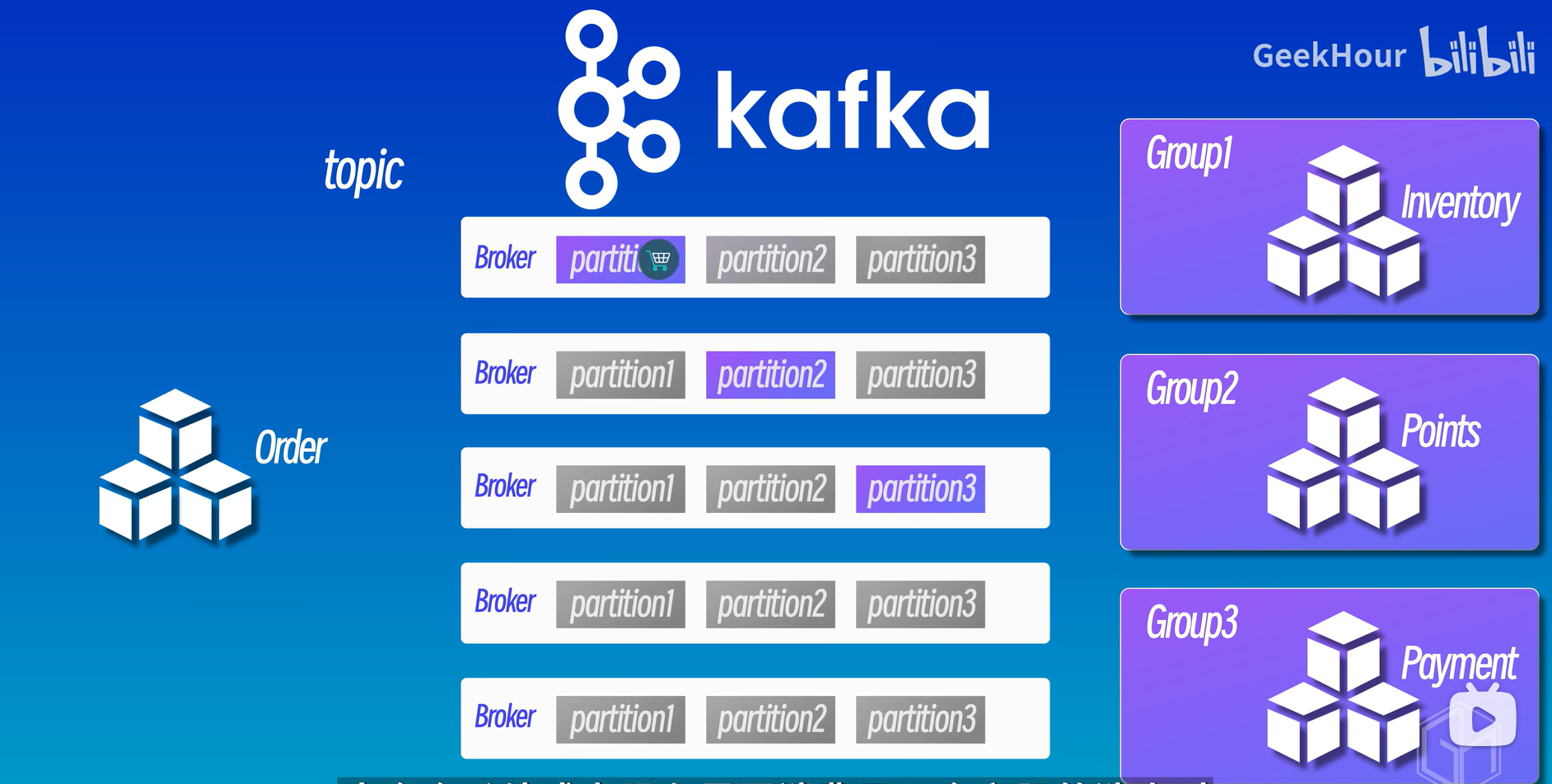 分区Partition:每个主题可以细分为分区,每个分区可以被不同消费者线程并行处理;分区内消息有序,分区间不保证有序;如果想要保证交易记录是有序的,可以把一个用户对应一个分区,这样可以保证每个用户是有序的;