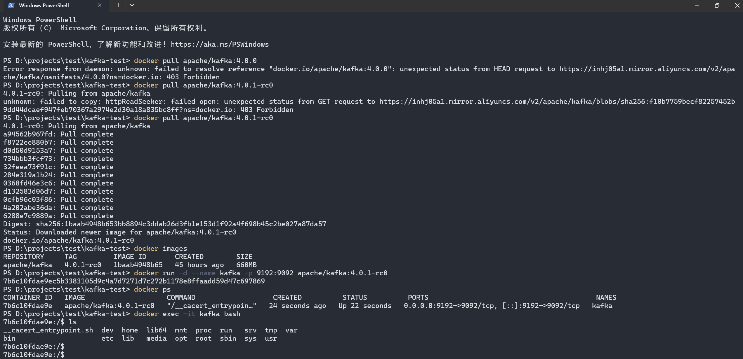 然后:docker run -d --name kafka -p 9192:9092 apache/kafka:4.0.1-rc0,后台启动;