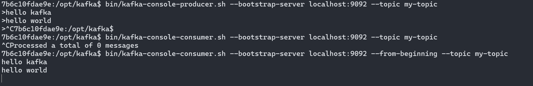 1 2 3 bin/kafka-console-producer.sh --bootstrap-server localhost:9092 --topic my-topic bin/kafka-console-consumer.sh --bootstrap-server localhost:9092 --topic my-topic bin/kafka-console-consumer.sh --bootstrap-server localhost:9092 --from-beginning --topic my-topic