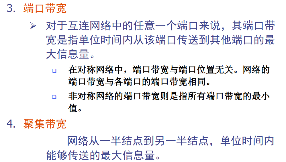 通信时延:指从源结点到目的结点传送一条消息所需的总时间,它由以下4部分构成,软件开销,通道时延,选路时延,竞争时延。