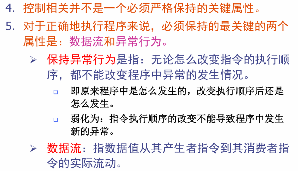 对于正常执行程序最重要的两个属性:数据流(数据从生产者到消费者指令的实际流动)和异常行为(改变指令顺序不改变异常发生的情况)。