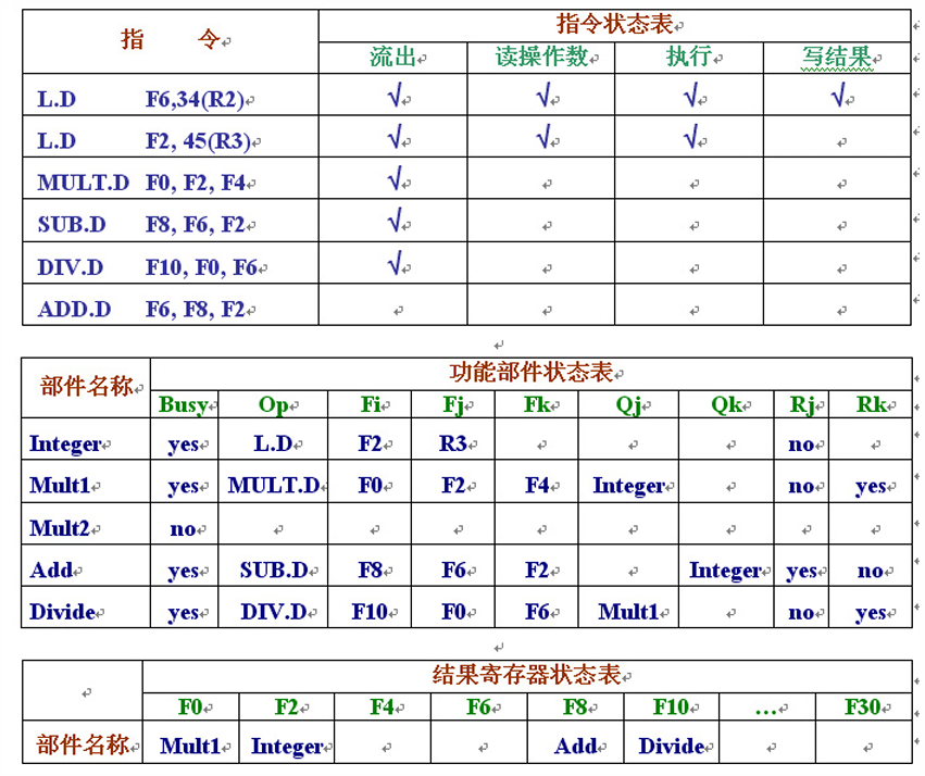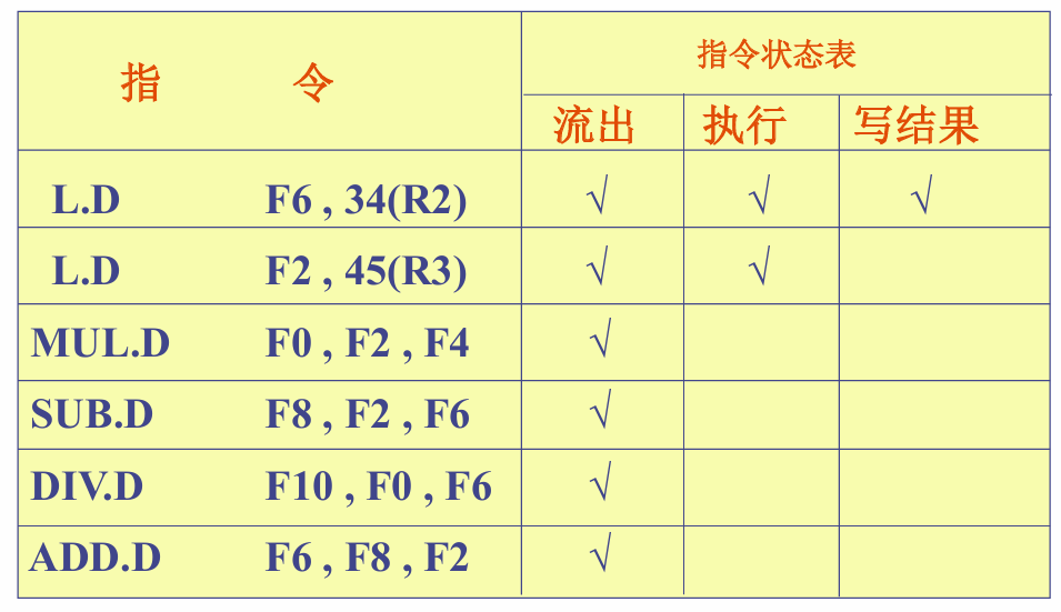 流出:如果当前流出指令所需的功能部件空闲,并且所有其他正在执行的指令的目的寄存器与该指令的不同,记分牌就向功能部件流出该指令(解决WAW)。