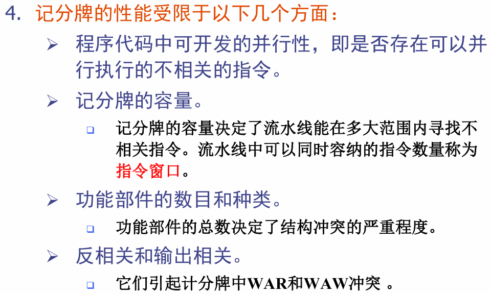 写结果:检测是否存在WAR冲突。如果不存在,或者原有的WAR 冲突已消失,记分牌就通知功能部件把结果写入目的寄存器。如果前面的某条指令(按顺序流出)还没有读取操作数; 而且:其中某个源操作数寄存器与本指令的目的寄存器相同,在这种情况下,记分牌必须等待,直到该冲突消失。