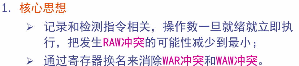 记分牌需要在流出和写结果段解决WAW和WAR冲突,Tomasulo使用寄存器换名解决WAW和WAR冲突。
