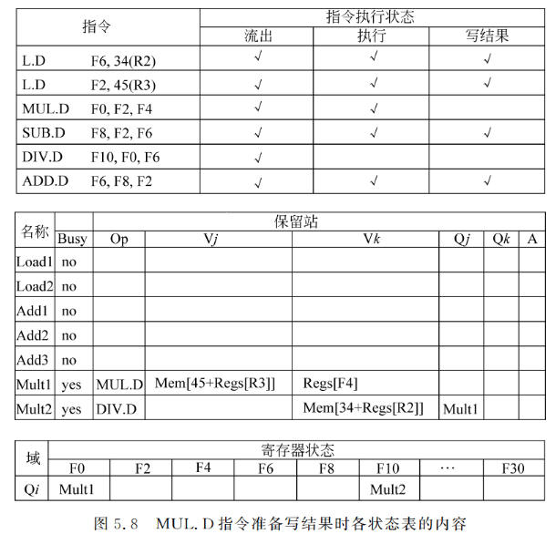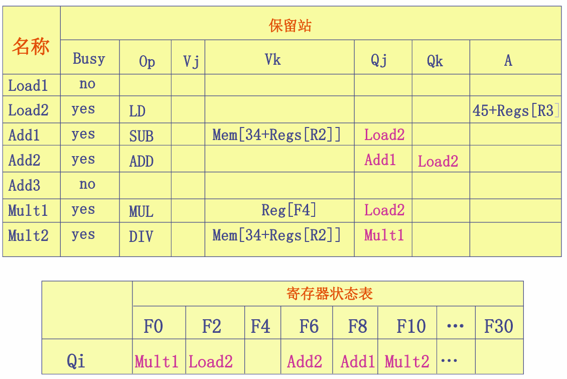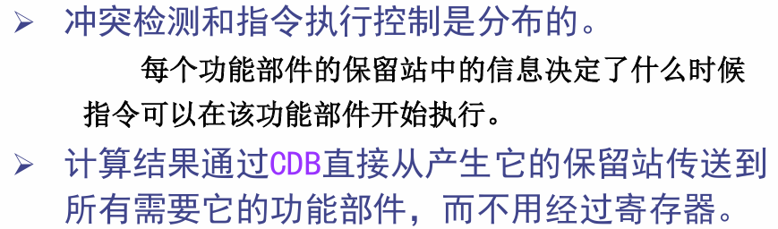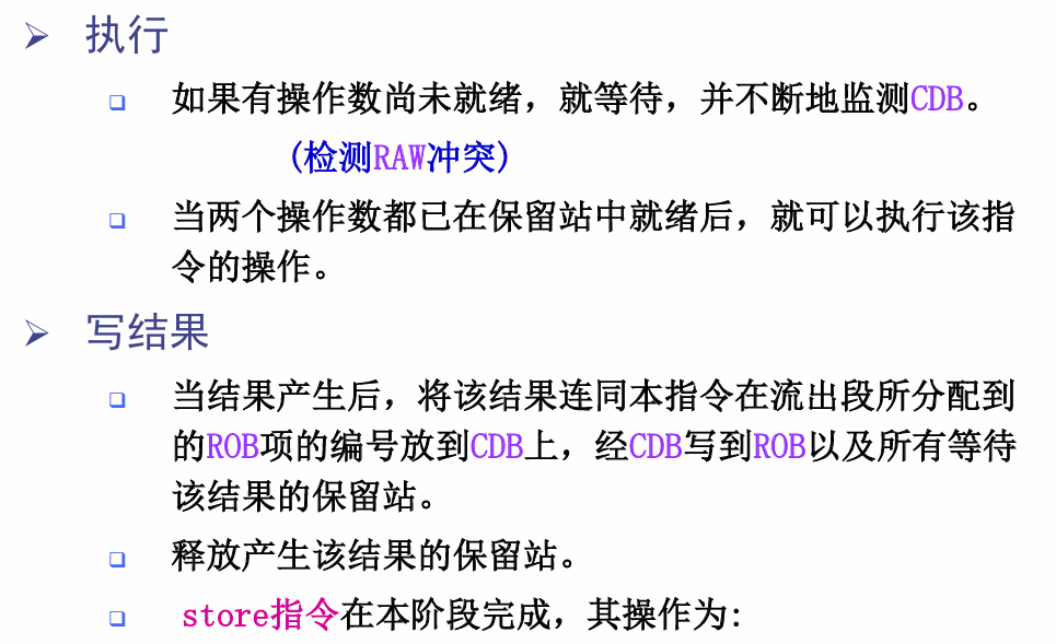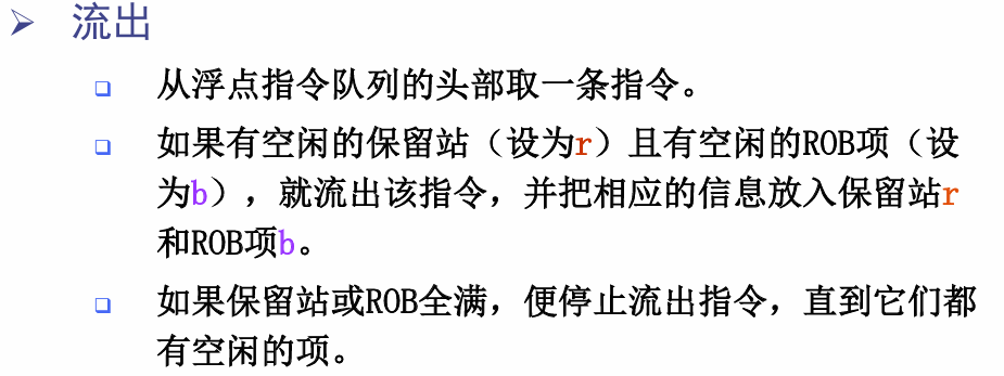 流出:若保留站有空闲,就把指令送到保留站r(结构冲突)。若操作数就绪,就送入保留站r。若操作数未就绪,就把将产生该操作数的保留站的标识送入保留站r,一旦被记录的保留站完成计算,它将直接把数据送给保留站r(解决WAR,WAW)。