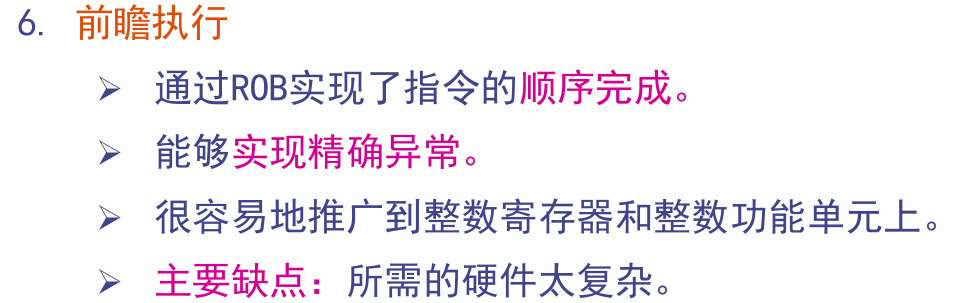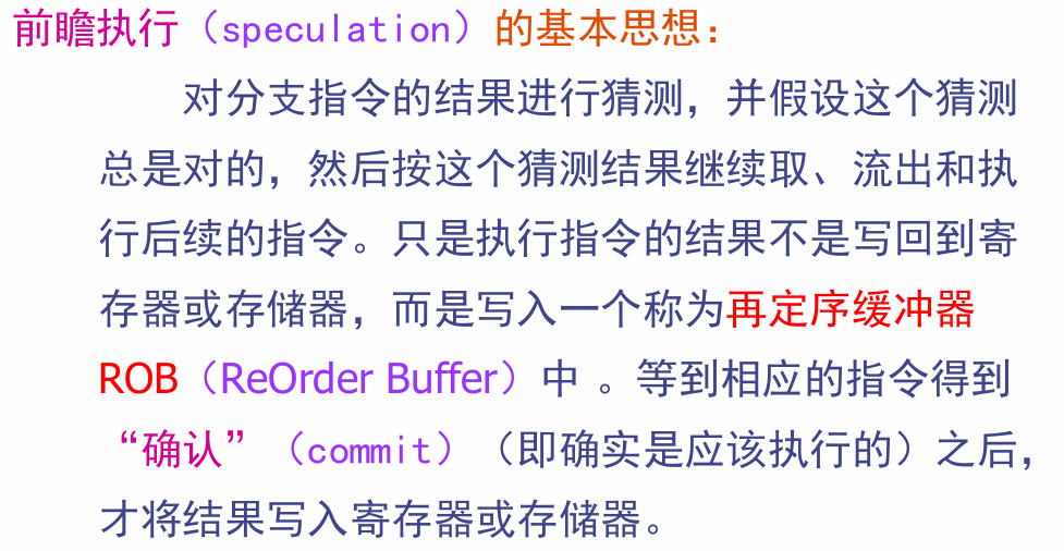 前瞻执行的基本思想:执行指令的结果写入ROB中,等到指令确认之后再写入寄存器存储器。