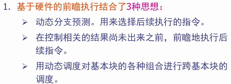 基于硬件前瞻执行三种思想:动态分支预测;在控制相关结果尚未出来之前,前瞻的执行后续指令;动态调度进行跨基本块调度。