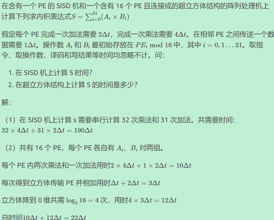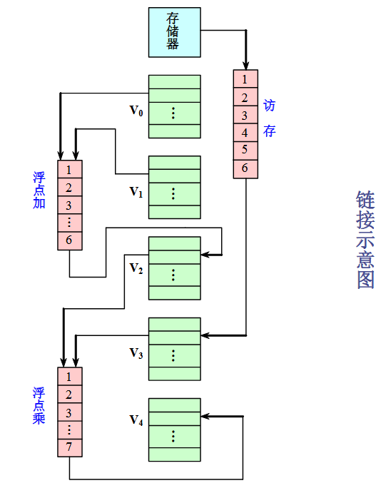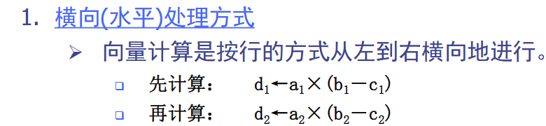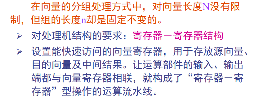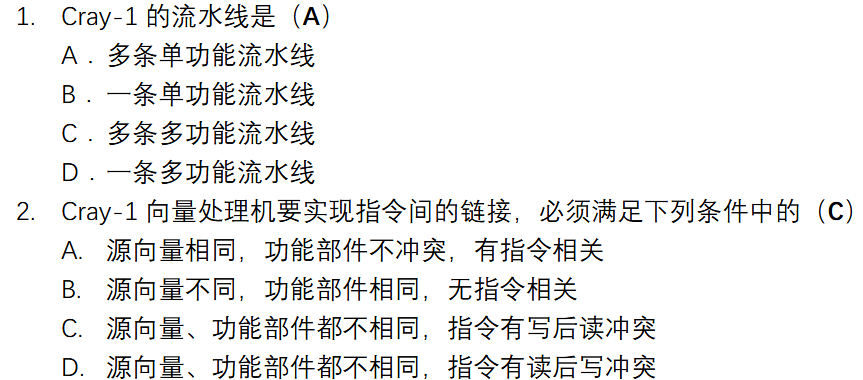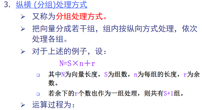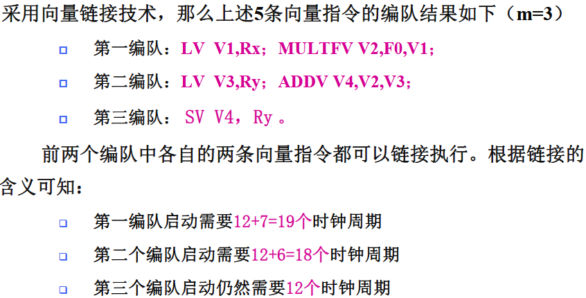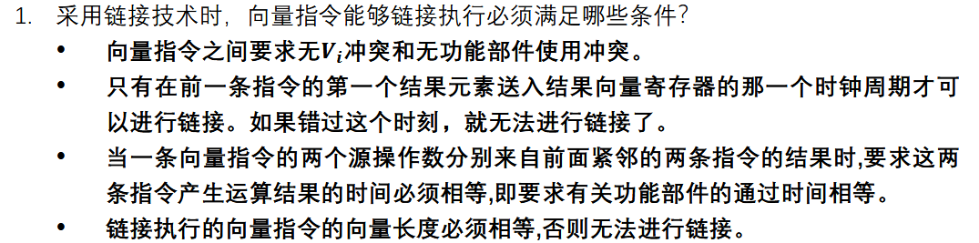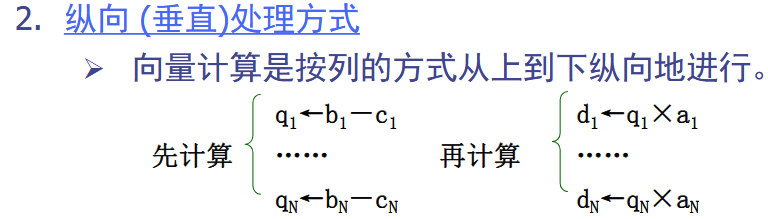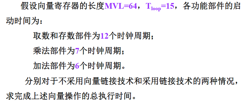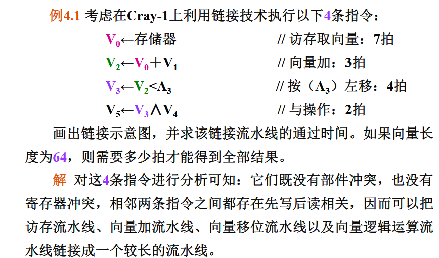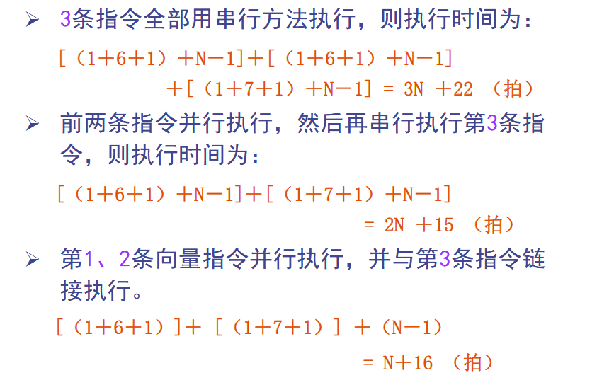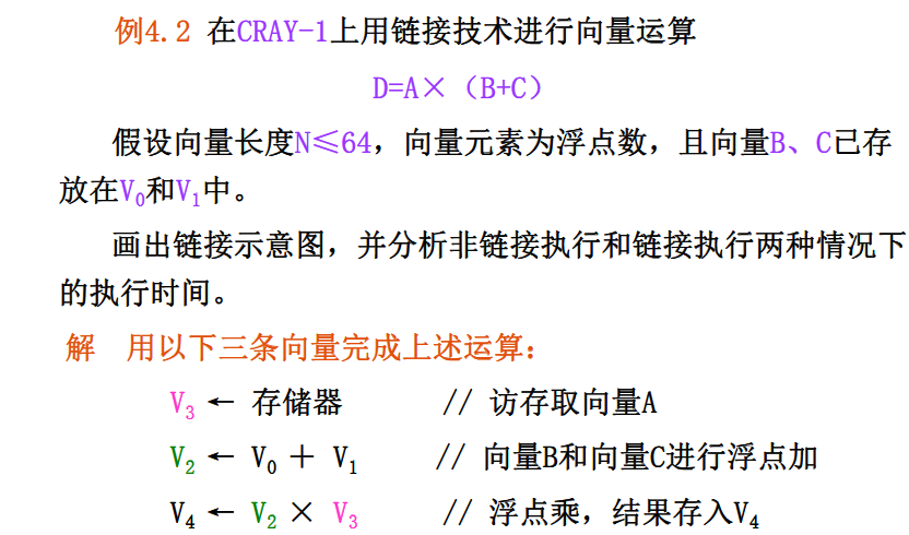 注意这里是一二两条指令可以并行的。如果不链接,就是纵向处理(因为 CRAY-1 为寄存器-寄存器结构,这是分组处理方式,该计算机的向量寄存器为64位,题目中N小于64不需要分组,也就是纵向了)。