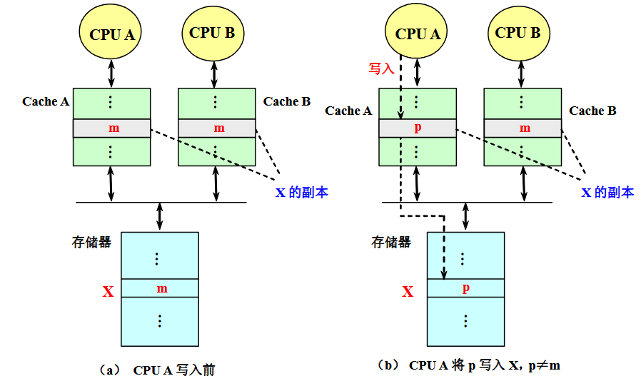 共享数据进入Cache产生了一个新的问题:Cache的一致性问题。