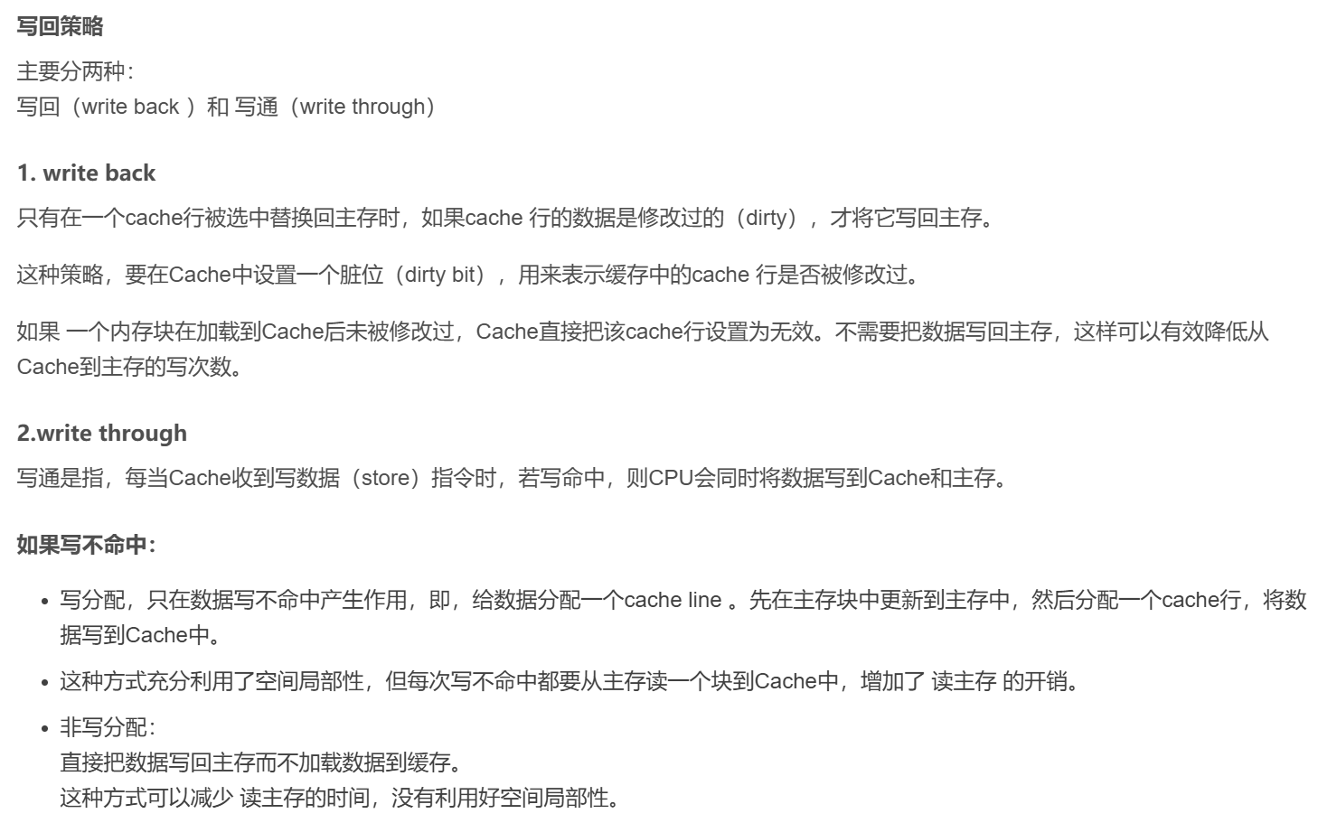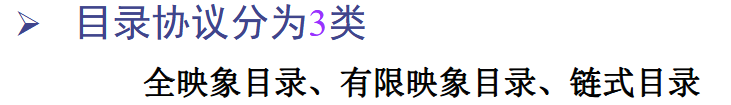 Cache一致性协议:目录式协议(物理存储器中数据块的共享状态被保存在一个称为目录的地方),监听式协议(每个Cache除了包含物理存储器中块的数据拷贝之外,也保存着各个块的共享状态信息)。