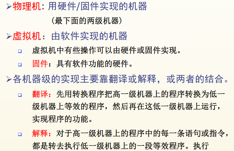 翻译:先用转换程序把高一级机器上的程序转换为低一级机器上等效的程序,然后再在这低一级机器上运行,实现程序的功能。
