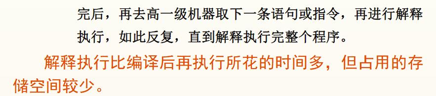 解释:对于高一级机器上的程序中的每一条语句或指令,都是转去执行低一级机器上的一段等效程序。执行完后,再去高一级机器取下一条语句或指令,再进行解释执行,如此反复,直到解释执行完整个程序。