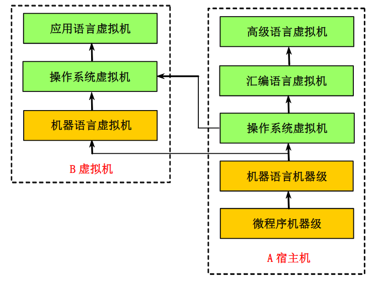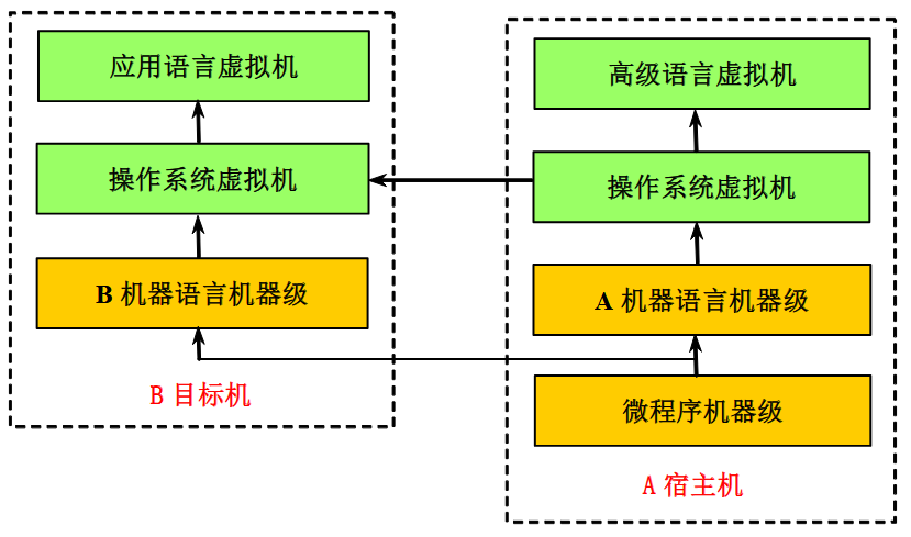 模拟:用软件的方法在一台现有的机器(称为宿主机)上实现另一台机器(称为虚拟机)的指令集。